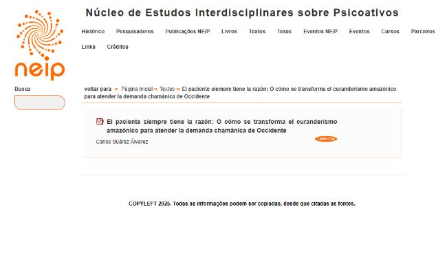 Este artículo desarrolla las ideas que expuse en el V Congreso de la Asociación Latinoamericana de Antropología. Explica cómo el chamanismo ayahuasquero se ha transformado para atender a los miles de extranjeros que cada año viajan a Iquitos y otras ciudades selváticas para probar la medicina amazónica, así como los problemas que se derivan de esta transoformación. Publicado por el Núcleo de Estudios Interdisciplinares sobre Psicoactivos.