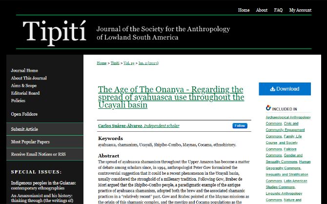 Este artículo, publicado en la revista de antropología Tipití, se mete de lleno en una controversia académica: ¿fue la ayahuasca adoptada recientemente por algunos pueblos, como los Shipibo, a los que se suele atribuir un consumo milenario? El antropólogo Peter Gow y el etnomusicólogo Bernd Brabec de Mori sugirieron esta idea a través de dos influyentes artículos. Yo argumento sólidamente en dirección opuesta.
