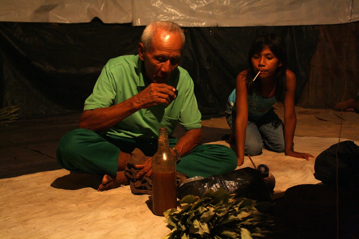 En la maloca de don Pancho el remedio se toma miércoles y sábados, a eso de las ocho de la noche. Allá se reúne una variopinta y leal parroquia. Por ejemplo, Erasmo: sonriente, gordito, de mejillas redondas y ojos escondidos, comunicativo. “Vengo a ayudar a cantar a don Pancho, a atender a los pacientes”, explica mientras esperamos el inicio de la ceremonia. Empezó a tomar con treinta años (tiene sesenta y siete), porque se puso enfermo y en el hospital no pudieron hacer nada. Entonces conoció al maestro Ventura quien le curó y le animó a aprender. Bajo su tutela siguió la dieta y se inició en el chamanismo. Recuerda riendo: “Daba miedo tomar porque aparecen muchos malos espíritus. Tras dejar que el remedio entrara en él, “salió el cigarrillo, salió el trago”, y ya ni siquiera le interesa el fútbol. Sólo le importa “la amistad, conocer gente, conversar”. Con Don Pancho empezó a tomar veinte años atrás… y el resultado: se casó con su hija. Dice Erasmo: “Ayahuasca es un remedio muy bueno, enseña toda clase de medicinas vegetales. Enseña el pasado y el futuro”, y se lanza a un discurso sobre Dios, el amor, y el demonio.