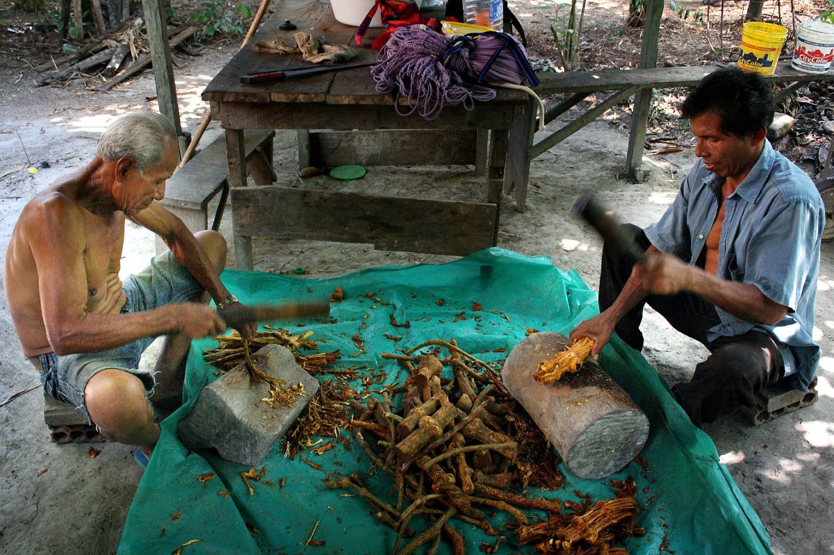 Don Pancho machaca la ayahuasca con la ayuda de uno de sus aprendices.