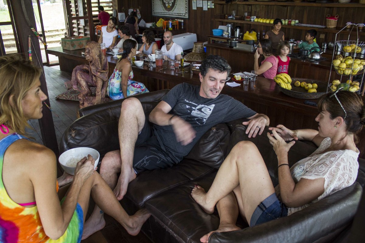 Un grupo de visitantes comparte el espacio común de Ani Nii Shobo, la gran casa que hace las veces de comedor, cocina y sala de estar.