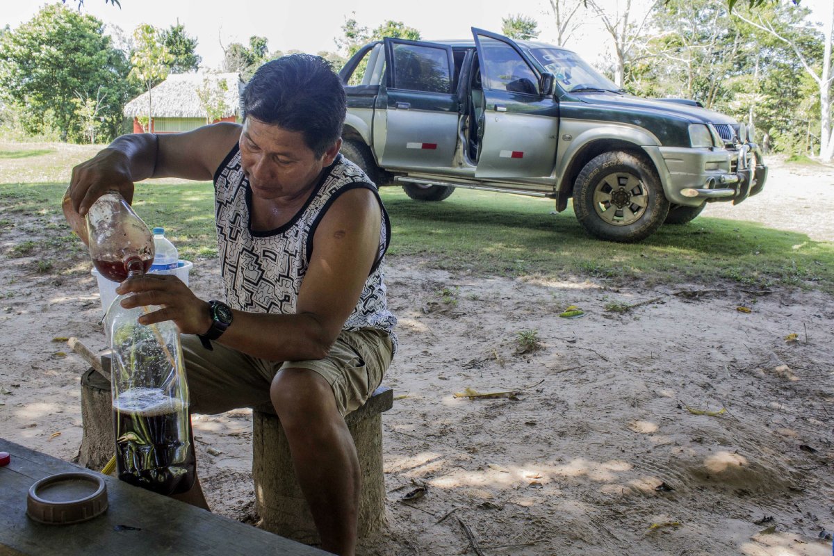 Roger López prepara un remedio natural para uno de sus pacientes de Suipino, el centro de medicina natural que montó por sí solo. Roger, que pertenece a la etnia shipiba, es uno de los más destacados hombres de su pueblo, respetado por haberse convertido en un próspero empresario a partir de su conocimiento de las plantas medicinales.