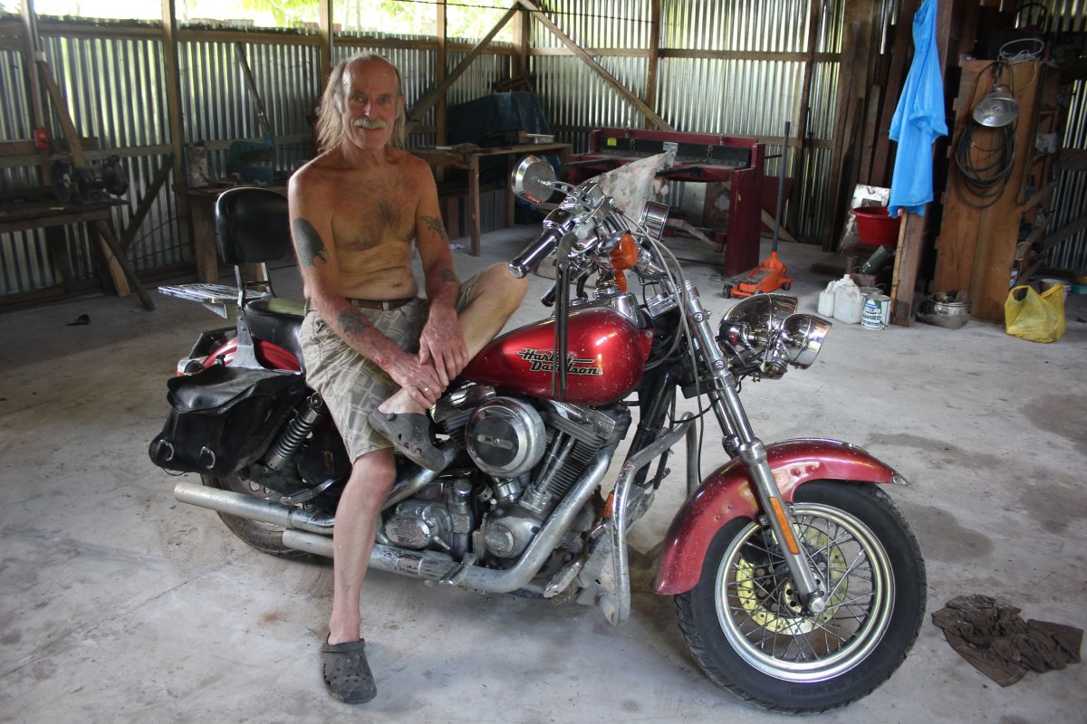 Ron posa con una Harley de su propiedad. El negocio de la ayahuasca le ha hecho un hombre adinerado.