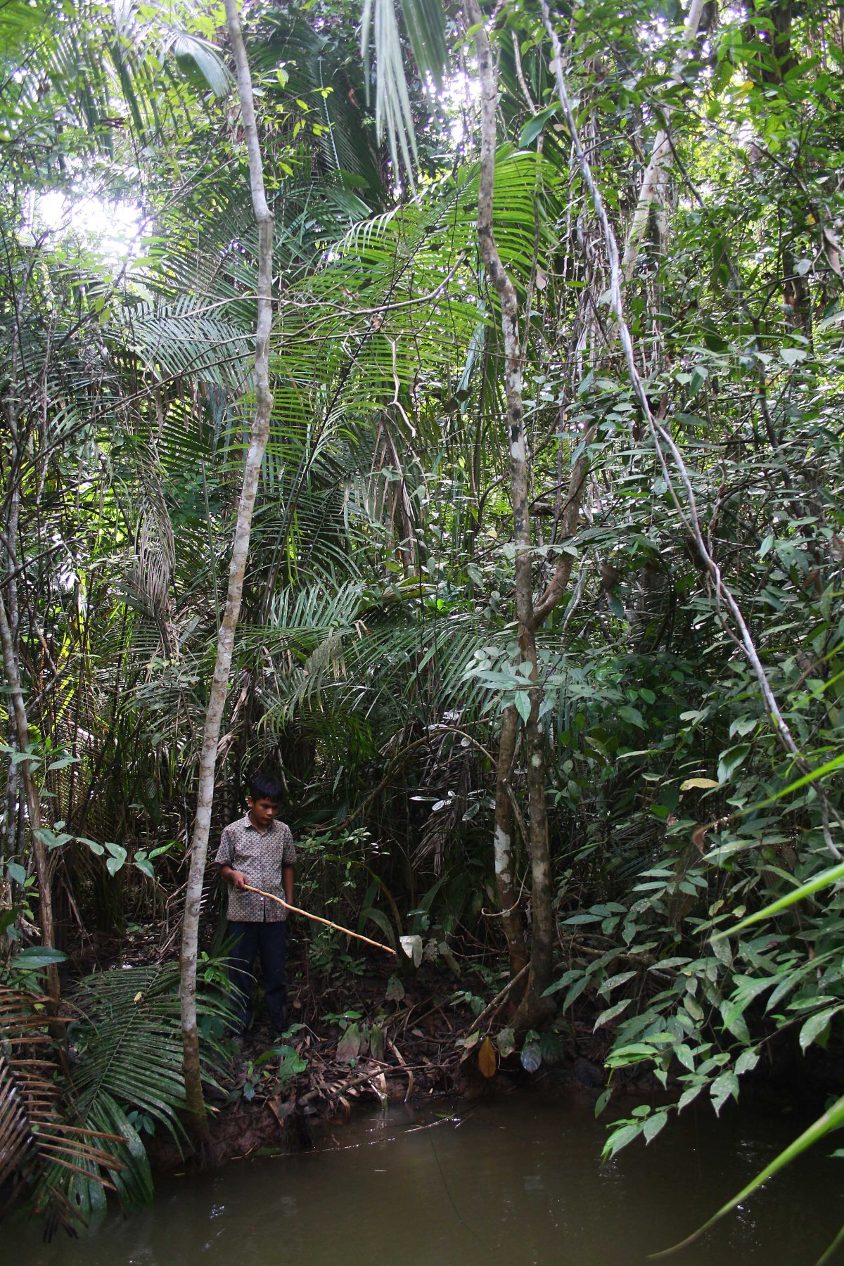Dos horas después el camino deja de existir: apenas se intuye el paso de personas en la ligerísima depresión de las hojas que tapizan el suelo. Llegamos a un arroyo de un metro de anchura, de aguas verdes y opacas, que se empoza cada tantos metros. Sin preámbulos, como niños que se entregan a un juego, dejan sus pertrechos en un pequeño claro, consiguen una vara flexible y anudan un sedal de nailon verde con anzuelo. El cebo son pedacitos de pescado que han traído en la mochila. Reinón reta a su vecino y a sus hijos: “A ver quién chapa más”. Y no transcurre ni un minuto antes de que saque del agua un ejemplar de fasaco de casi un kilo. Su vecino, el Chato, no se queda atrás. En una hora Reinón ha capturado veinte o veinticinco grandes pescados; entonces dejan de picar y nos movemos, siguiendo el curso de agua gracias a caminitos casi indistinguibles; así actúan los vecinos de Vencedor sobre la naturaleza, alterándola lo mínimo para disfrutar de sus dones largamente. El abigarrado piar de los pájaros, una sinfonía, celebra su determinación.
