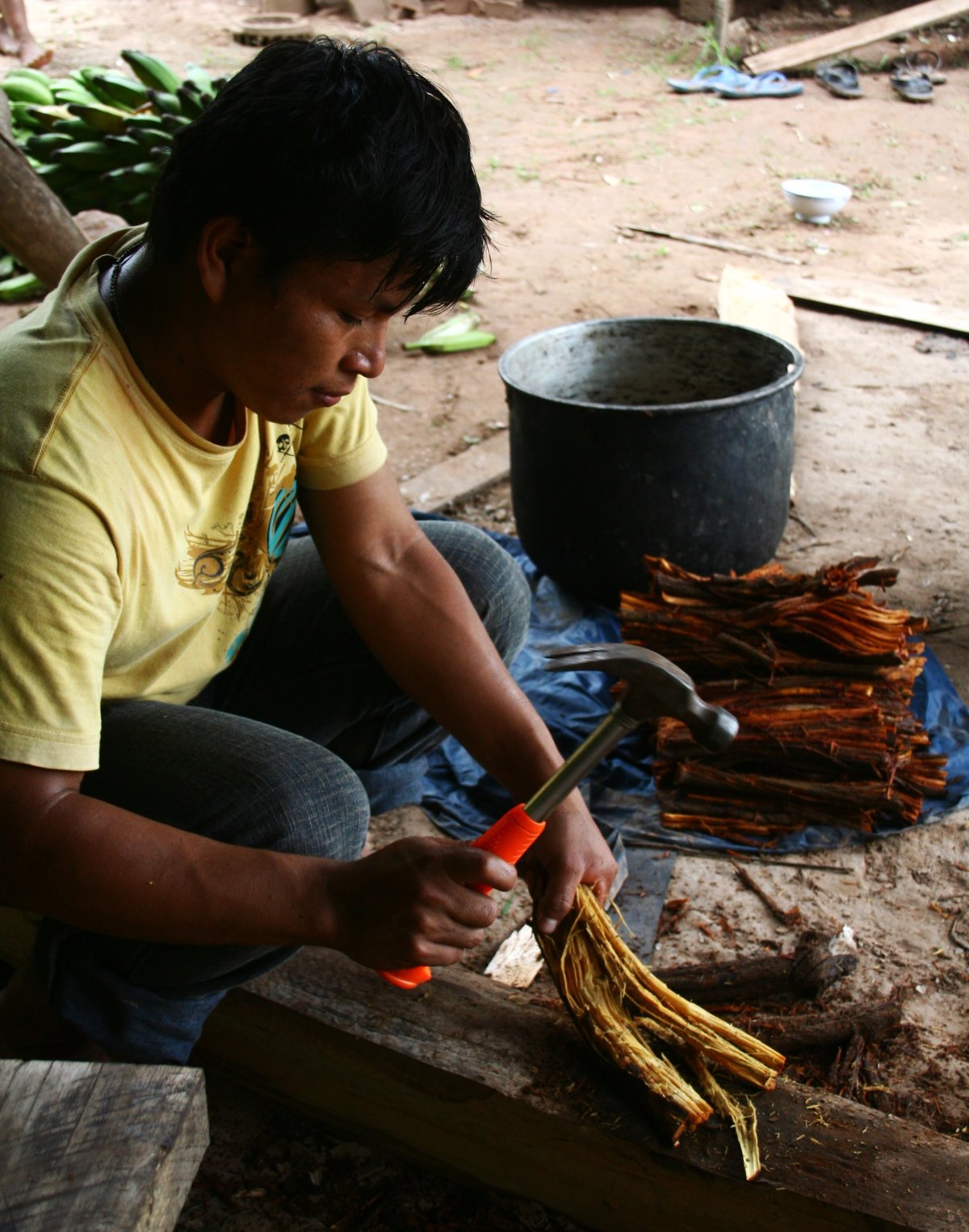 Misael Vásquez machaca tallos de la enredadera ayahuasca para elaborar la medicina.