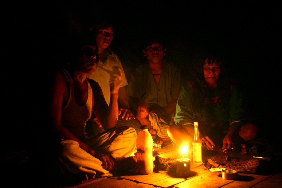 Misael no se separa de su pequeña Biblia de bolsillo. “En la Biblia hay un gran conocimiento”, sentencia. Me sorprende cómo esta mitología de violencia, castigo, muerte, ira, censura y crueldad, ha calado entre los shipibos: gente sosegada, poco dada al enfrentamiento, donde cada uno hace su vida más o menos libremente, con alegría, sin culpa. Esa Biblia la tiene a sus pies en la última ceremonia de ayahuasca que vamos a compartir. Son las siete y media de la noche en casa de Pedro Pérez. Una pequeña vela alumbra débilmente a los presentes. Varios enfermos están descansando tumbados más allá del círculo que formamos los tres maestros (Justina, César y Pedro), Misael, el hijo de César, y yo. Pedro sopla levemente una melodía sobre la boca de la botella de ayahuasca; está icarando, conjurando a sus espíritus aliados para que garanticen el éxito de la curación. Los presentes fuman. “El tabaco ahuyenta los malos espíritus”, me explica Misael mientras apura un cigarrillo. Después tomamos una dosis del brebaje. Misael se concentra inmediatamente, inclina la cabeza hacia abajo y cierra los ojos.