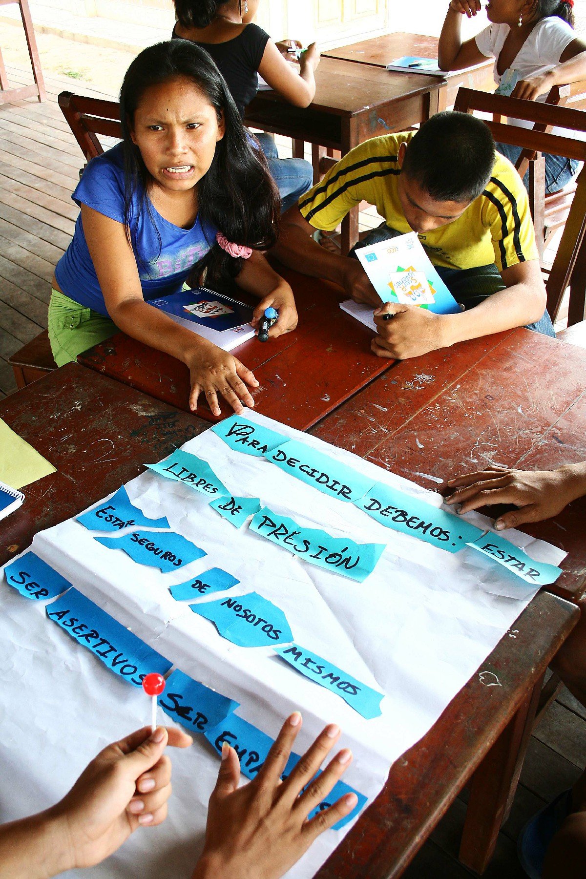 A treinta metros de donde cocina pescado la adulta Glenny, quinceañera Ojos de Gata, señoritas de mayor edad asisten a un taller, impartido por la ONG en cuestión, del que saldrán formadas como promotoras de salud sexual: predicadoras de la nueva moral entre primas y vecinas. Los responsables del taller son dos veinteañeros mestizos de la cercana ciudad de Pucallpa, que no son psicólogos, ni antropólogos, ni sociólogos, sino animadores socioculturales, y se nota porque tienen carisma para desarrollar dinámicas de grupo, que versan sobre el uso de la violencia y la presión de grupo para condicionar comportamientos. El taller se cierra con vehementes recomendaciones: “Tienen que tomar sus decisiones sin ser presionados. Por ejemplo, si el papá quiere que vaya a la chacra, negocien. ‘Papito, voy a terminar mi tarea y después voy a la chacra’”, explica la monitora, estableciendo nuevas prioridades productivas, relegando la horticultura a forma de vida “atrasada”. El monitor secunda: “¡Ojo! Nadie nos puede tocar, nadie nos puede vocear, nadie nos puede golpear. Que nos den otro tipo de castigo: que no nos dejen ver la televisión, pero que no nos agarren a cañabravazos. Queremos otro tipo de castigo”, cuestionando la autoridad antaño absoluta que los progenitores tenían sobre su descendencia, y la disciplina física, comprensible en una sociedad donde el endurecimiento del cuerpo era fundamental para la vida.