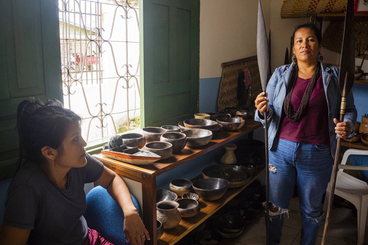 Silvana Marubo, coordinadora de MAI (Mujeres Artesanas Indígenas), sostiene dos lanzas típicas del pueblo matsés, en la tienda que el colectivo tiene en Atalaia do Norte.