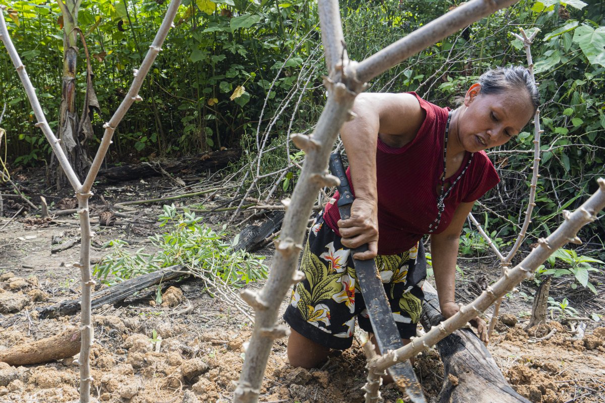 Patricia Mayoruna, coordinadora del grupo de mujeres del pueblo matsés, arrancando yuca, uno de los cultivos principales de los pueblos del Yavarí.