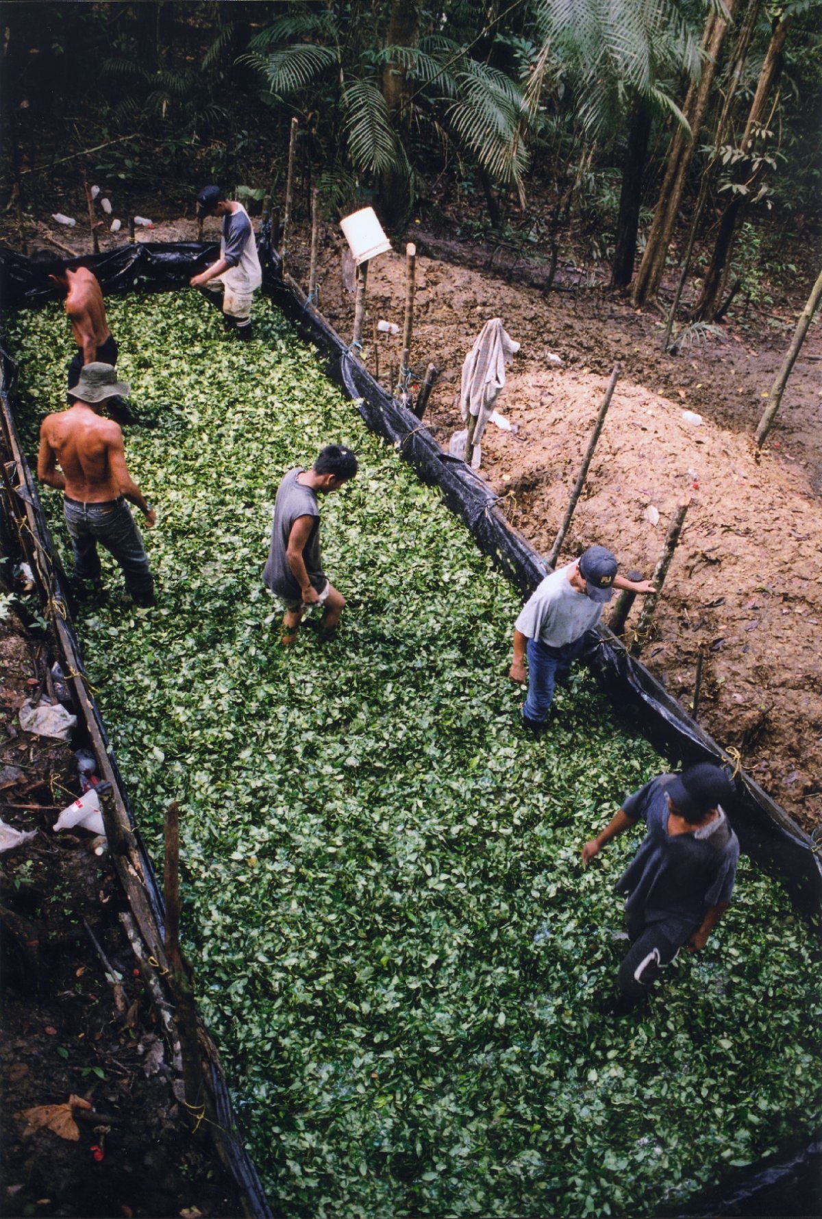 Camina en una de las piscinas de tres metros por quince cavadas en el suelo, forradas con plástico, en las que, en una mezcla de agua y líquido de batería de carro, se macera la coca. Con sus pisadas reduce a pedacitos las hojas, que van dejando salir el principio activo. Otros dos compañeros caminan a su lado y ocasionalmente remueven con las manos; así lo hacen durante todo el día. Por la noche se deja macerando y a la mañana siguiente, después de un par de caminadas, se trasvasa el líquido resultante a un gran bidón, en el que se mezcla con gasolina. Se remueve incansablemente con palas hasta que “pinta”, y tres líquidos con densidades diferentes se superponen: lo desechable por un lado, la gasolina por otro, y finalmente lo que se conoce como “el suero”, cuyo sabor y propiedades se comprueban con la lengua, que al contacto queda adormecida. El suero se recoge en un balde, donde se mezcla con cal, bicarbonato y permanganato sódico; se revuelve y en unos diez minutos se ha solidificado; después de una semana de trabajo habrán producido ciento cincuenta kilos de base de cocaína, y habrán vertido a la red fluvial cientos de litros de desechos químicos altamente contaminantes, otro golpe más a esta naturaleza tan prodigiosa como maltratada.