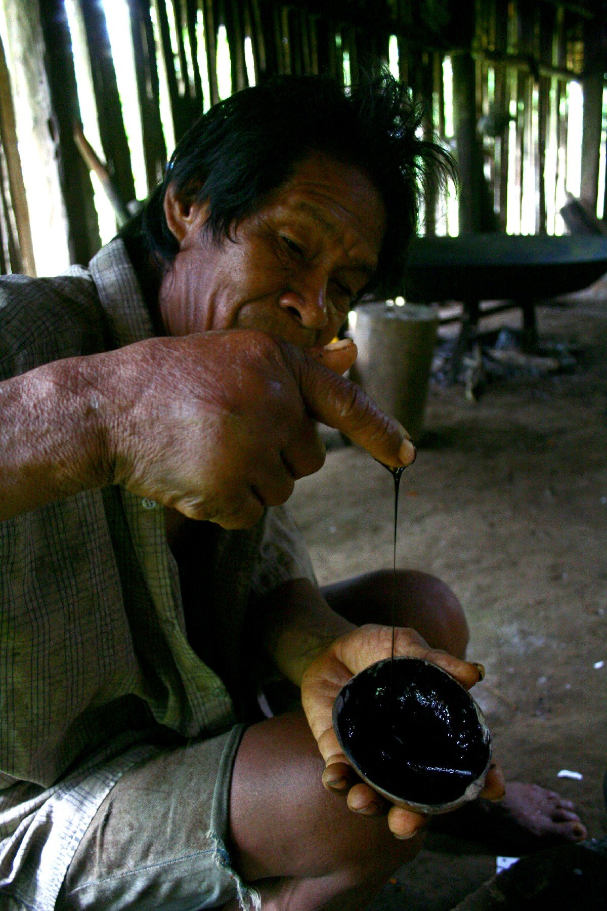 Fernando Pérez, de la etnia murui, preparando ambil en la maloca de su comunidad.