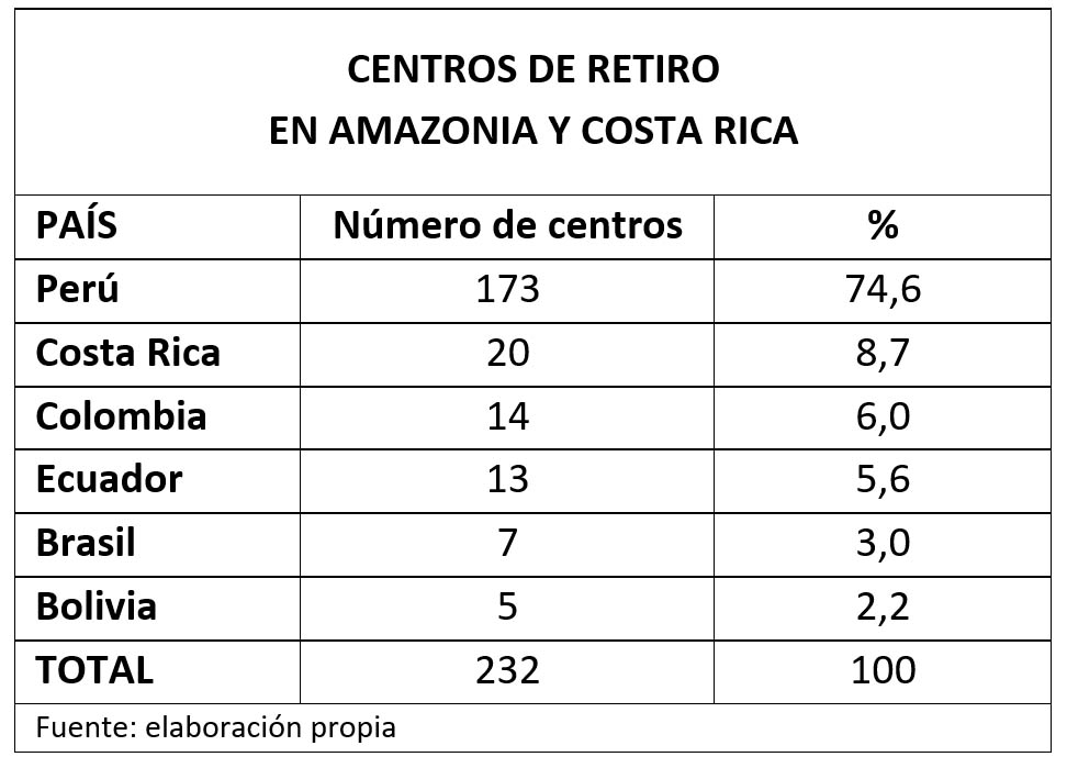Nuestra investigación nos permite a estimar que durante el año 2019, al menos 232 centros retiro funcionaban en los países amazónicos (Bolivia, Brasil, Colombia, Ecuador y, sobre todo, Perú) y en Costa Rica, que se ha convertido en lugar preferido por los empresarios de la ayahuasca para montar los centros.