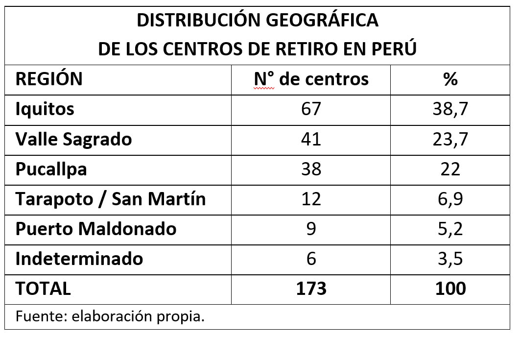 No es de sorprender que sea Perú el país que más centros tenga. Dos son las razones: por un lado, la arraigada tradición ayahuasquera del país, culminada con la Declaración de Patrimonio Cultural de la Nación de los conocimientos y usos tradicionales del ayahuasca practicados por las comunidades amazónicas; por otro, el desarrollo de un dinámico negocio turístico en ciudades como Iquitos, donde se encuentran la mayoría de los centros, o en el Valle Sagrado donde, aprovechando el tirón de Cuzco y Machu Pichu, se atiende a quienes no quieren o no pueden visitar la selva amazónica.
