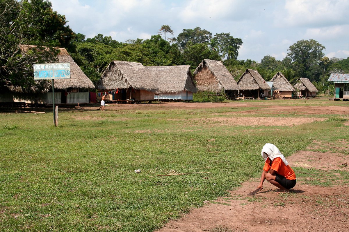 En las mañanas es corriente ver a las mujeres shipibas eliminando con el machete cualquier intento de la vegetación por remontar. Bajo las hierbas pueden esconderse serpientes venenosas.